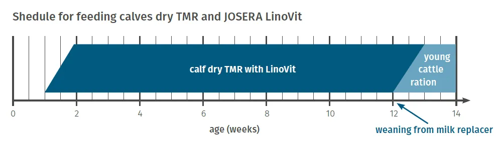 For the producing a calf dry TMR either the supplementary feed JOSERA LinoVit or a JOSERA mineral feed, e.g. Kälberprofi, is suitable.